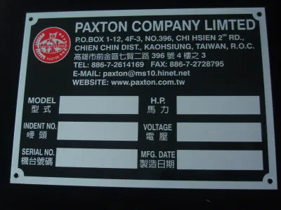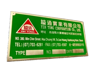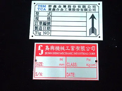上面為不鏽鋼蝕刻烤漆毛絲面銘牌,下面為鋁質平面機械銘牌。